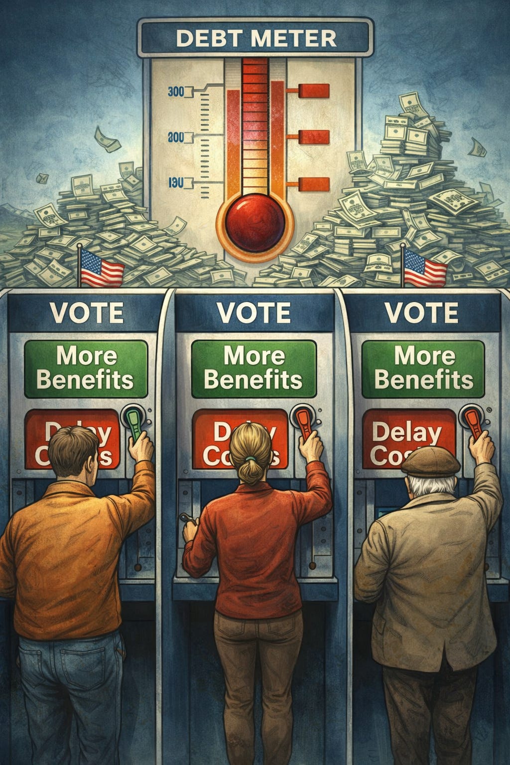 No administration is rewarded for restraint. The gains from discipline arrive later, often under someone else’s leadership. The losses arrive immediately—reduced benefits, higher taxes, political backlash.