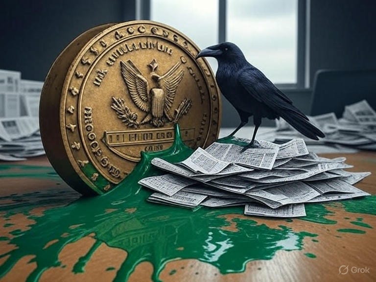 [A cracked DOJ seal leaking green ink, with a crow perched atop a pile of headlines.]