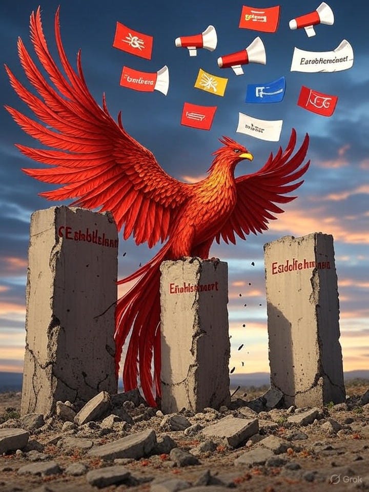 A phoenix rising from splintered pillars labeled “Establishment,” while opposing thought-bubbles clash overhead—some shaped like flags, others like megaphones.