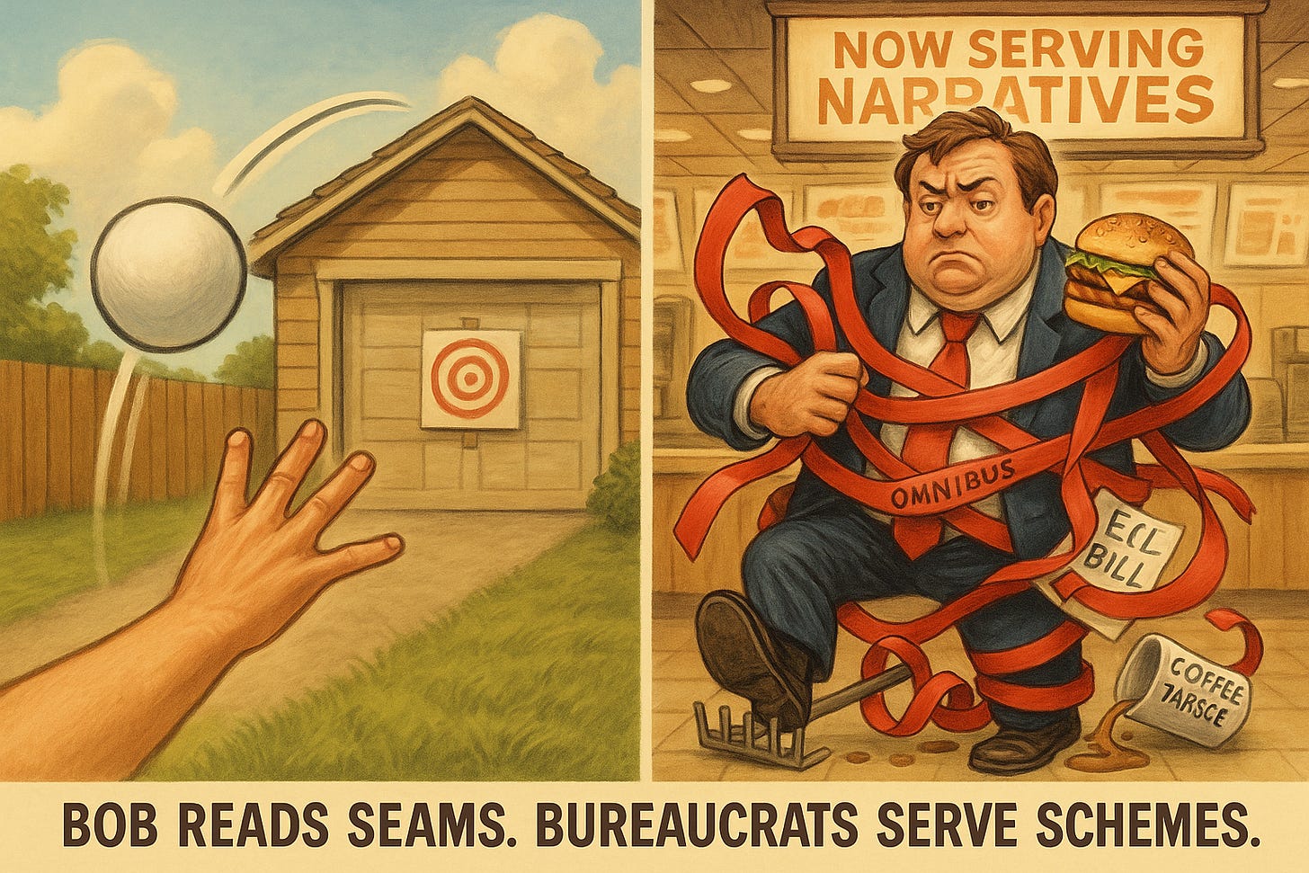They tried to feed us junk policy and call it nutritious. They dressed up bureaucracy as abundance. They even made ICE the villain and the burger the hero. But Bob’s still got that no-hole wiffle in his hand, reading every stitch of spin. Some days, the seams show. Some days, they fray. But as long as there’s light and air—and a little truth left—we’ll keep swinging. See you next storm.