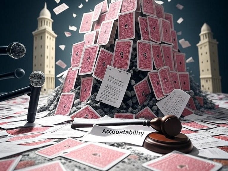 Graphic: A towering house of cards labeled “Deep State” collapses under a flood of declassified documents. Media microphones shatter like glass. Epstein files swirl in a whirlwind. A resolute gavel marked “Accountability” slams down amid crumbling ivory towers.