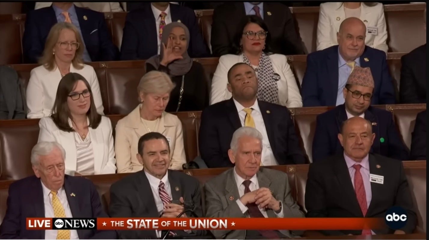 As we speak, Democrats in this chamber have cut off all funding for the Department of Homeland Security. It’s all cut off, all cut off. They have instituted another Democrat shutdown, the first one costing us two points on GDP. Two points we lost on GDP, which probably made them quite happy actually. Now they have closed the agency responsible for protecting Americans from terrorists and murderers. Tonight, I’m demanding the full and immediate restoration of all funding for the border security, homeland security of the United States, and also for helping people clean up their snow. We have no money because of the Democrats, and it would be nice. We’d love to give you a hand at cleaning it up, but you gave no money. Nobody’s getting paid. It’s a shame. So you have to think about it. We have, in case you didn’t know, a pretty large snowstorm out there. One of the great things about the State of the Union is how it gives Americans the chance to see clearly what their representatives really believe. So tonight, I’m inviting every legislator to join with my administration and reaffirming a fundamental principle.