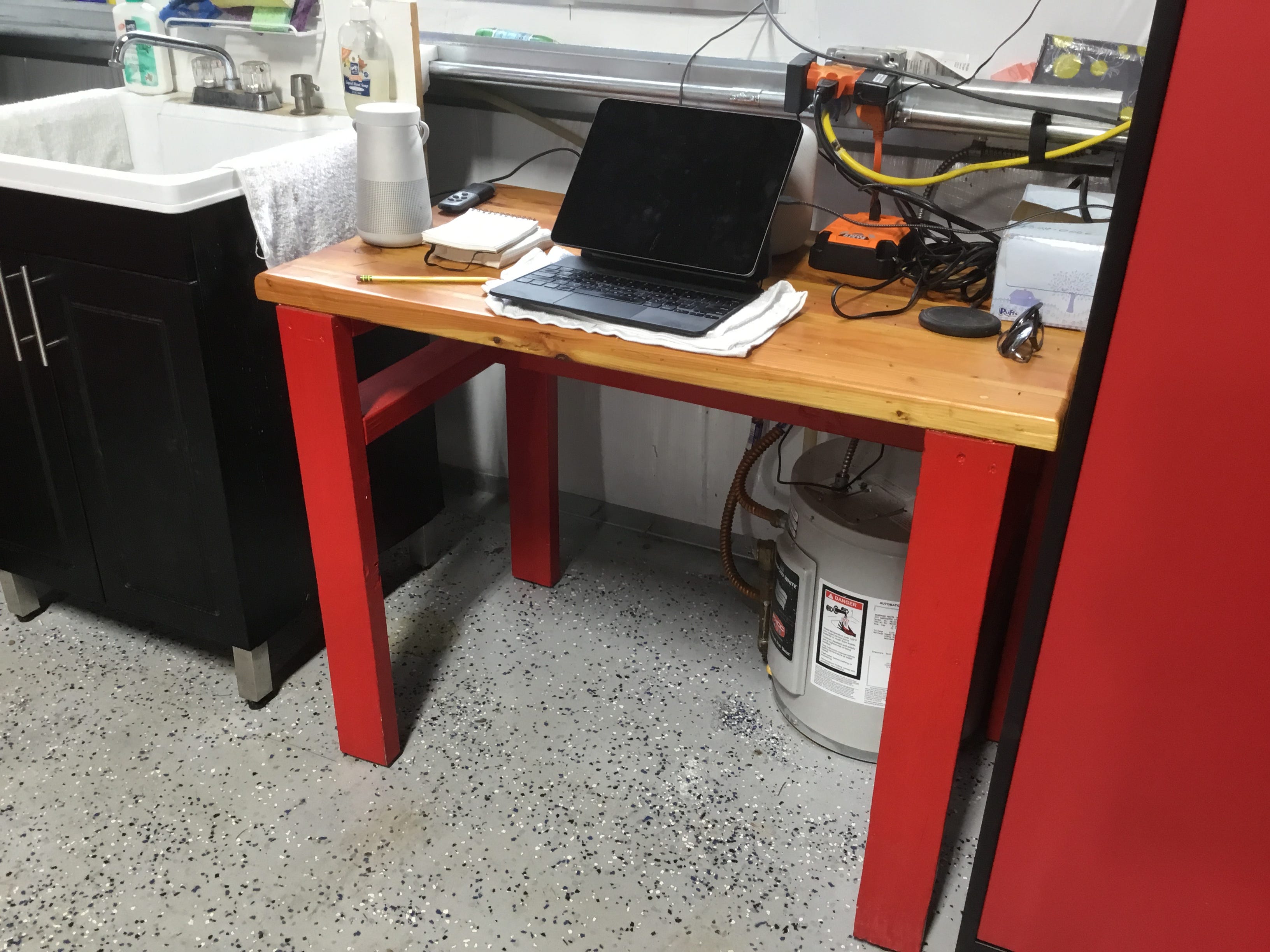[This is my custom-built table out in the shop/garage. I made it out of leftover 2x4s and my wife painted it bright Milwaukee red. It has four legs.]