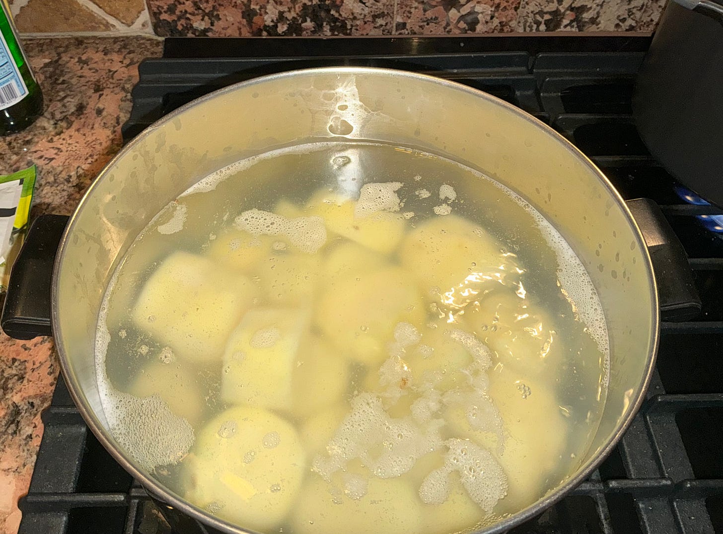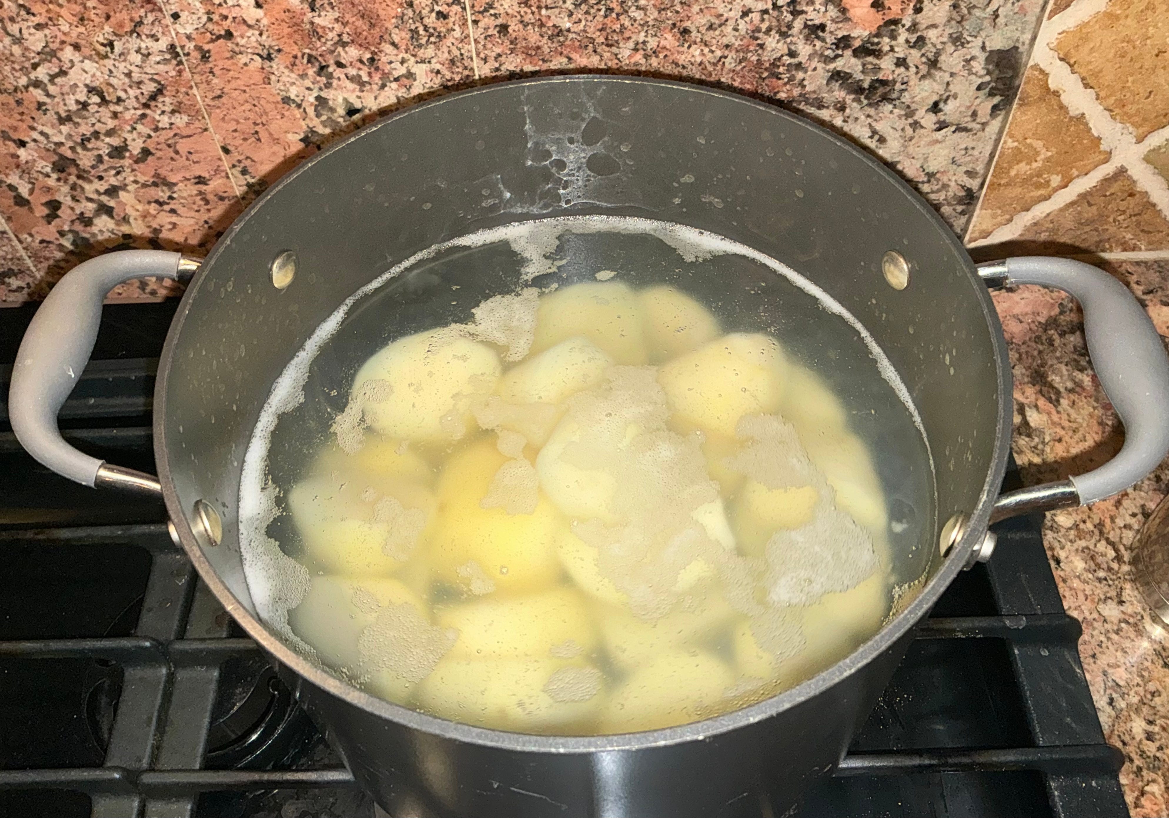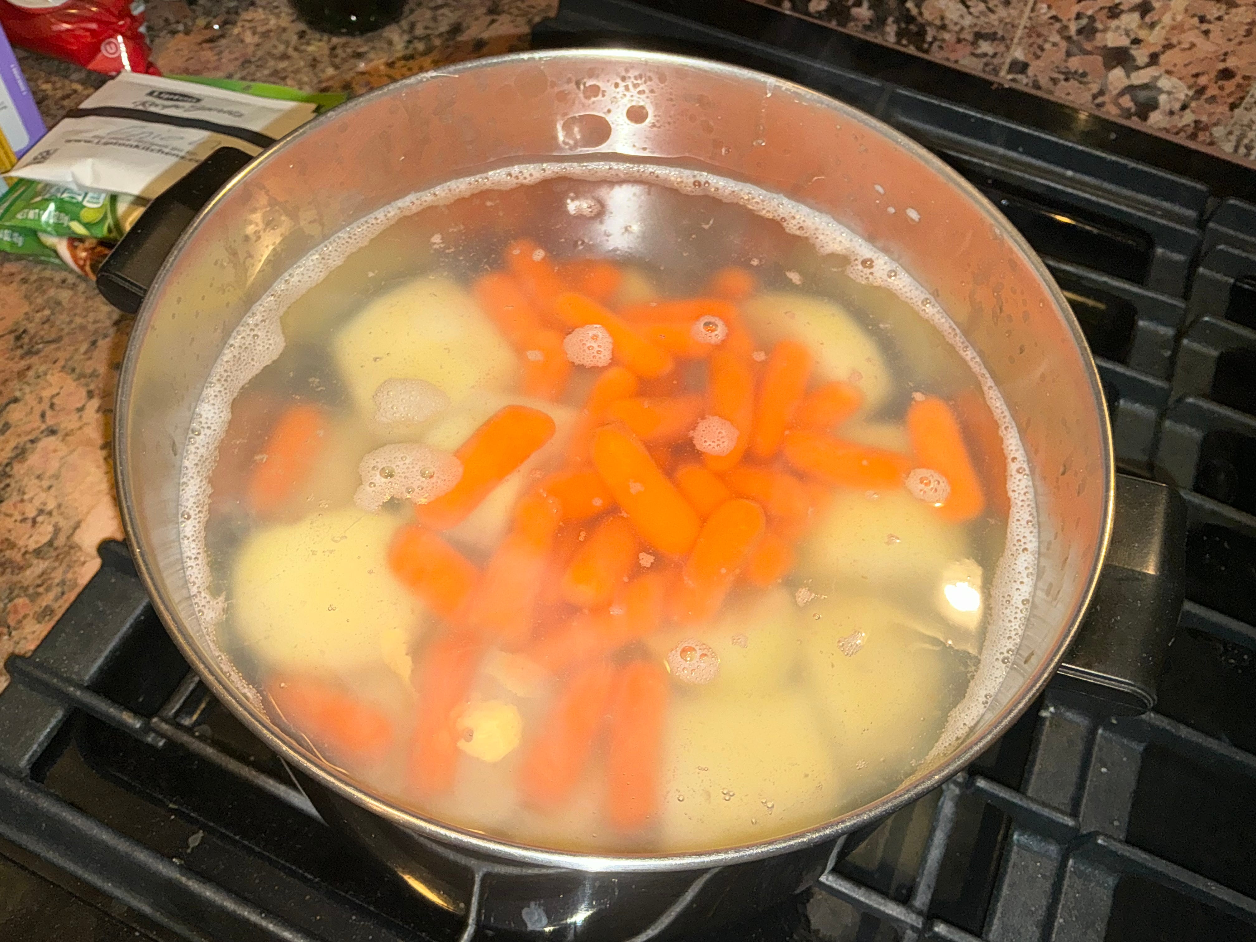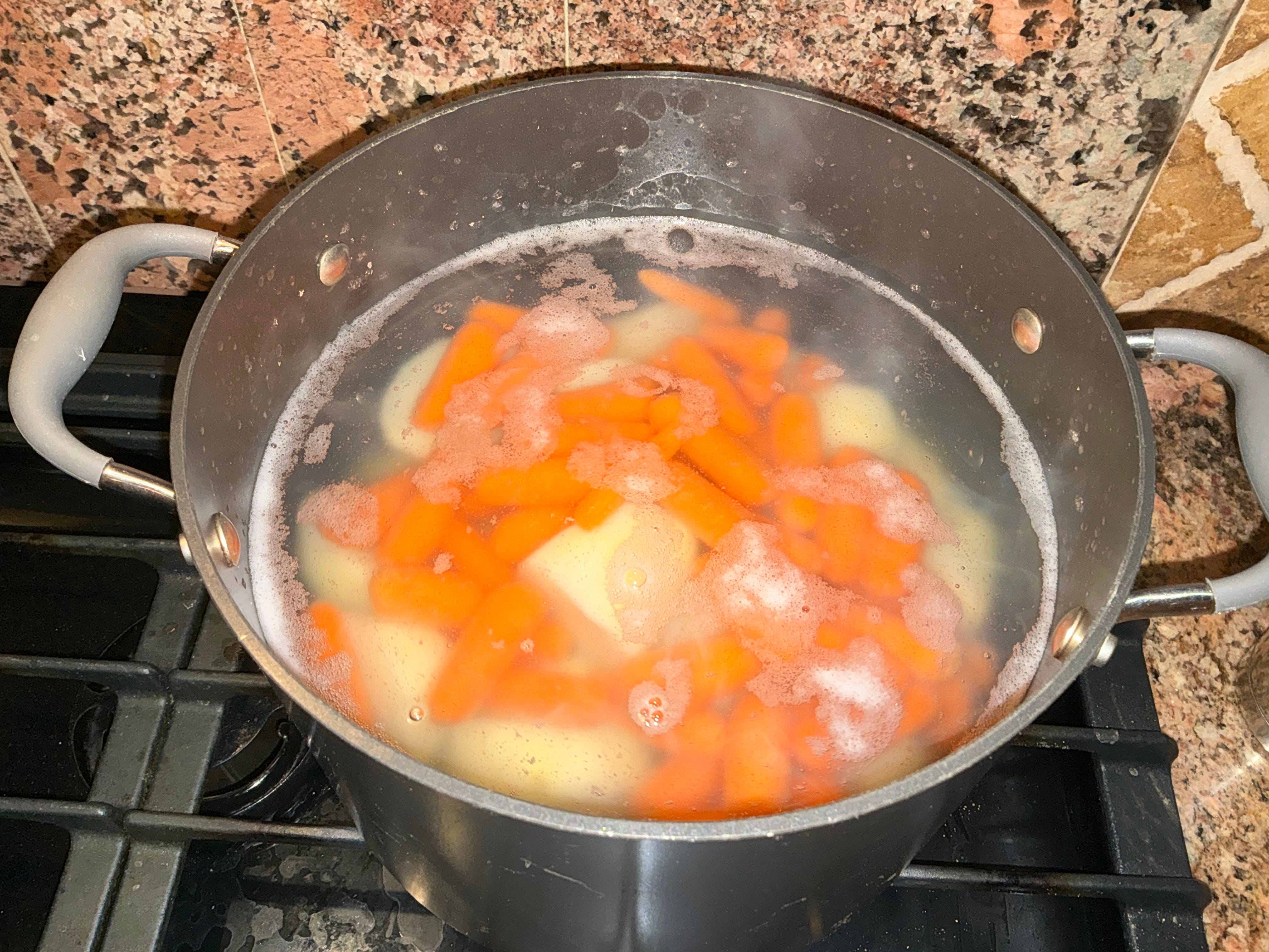 By this point, the potatoes will have been boiling for about an hour. The carrots are usually the last to soften, but everything should mash easily. My mother never used the baby carrots shown here — she sliced up whole carrots, sometimes peeling them first.