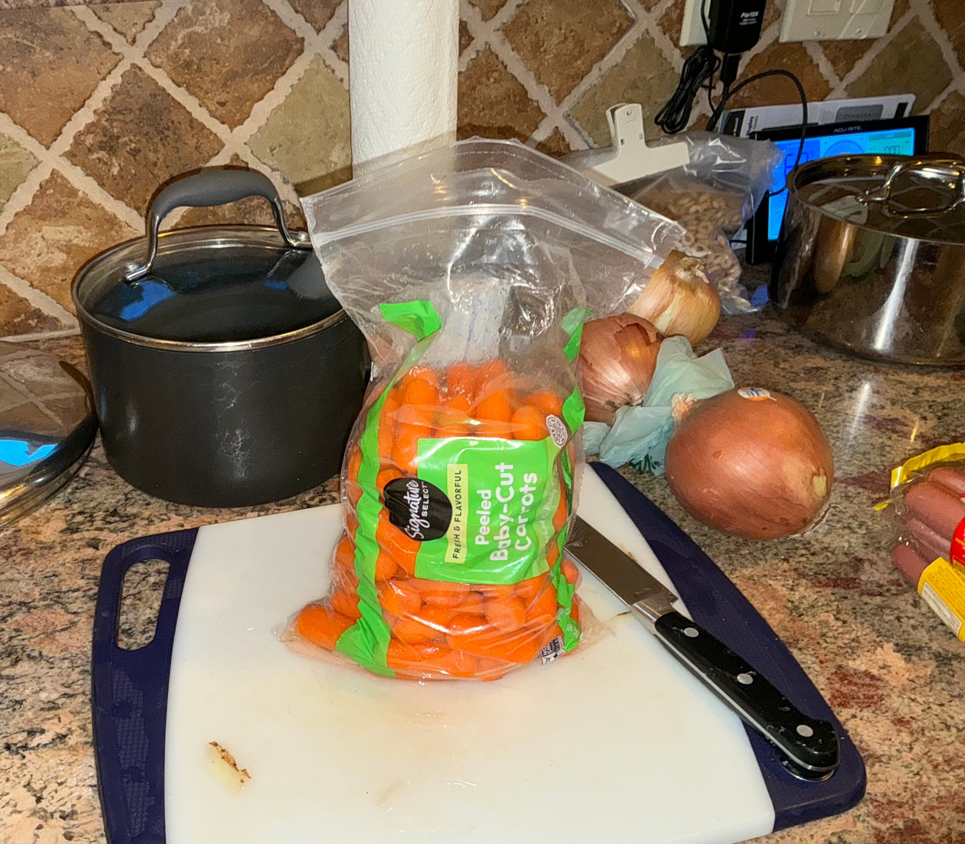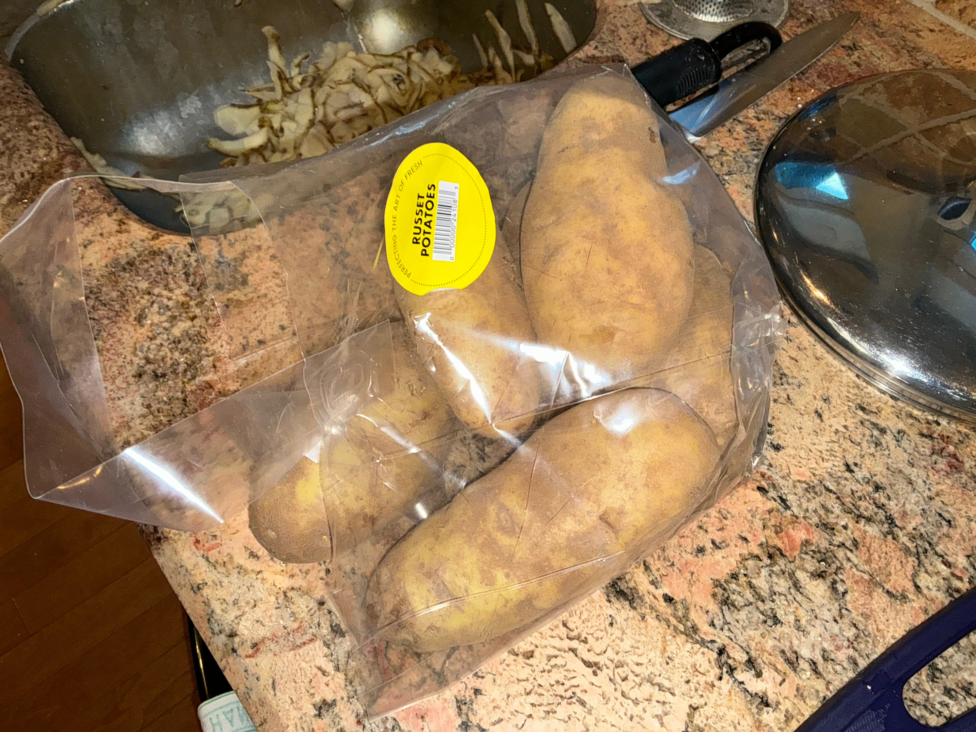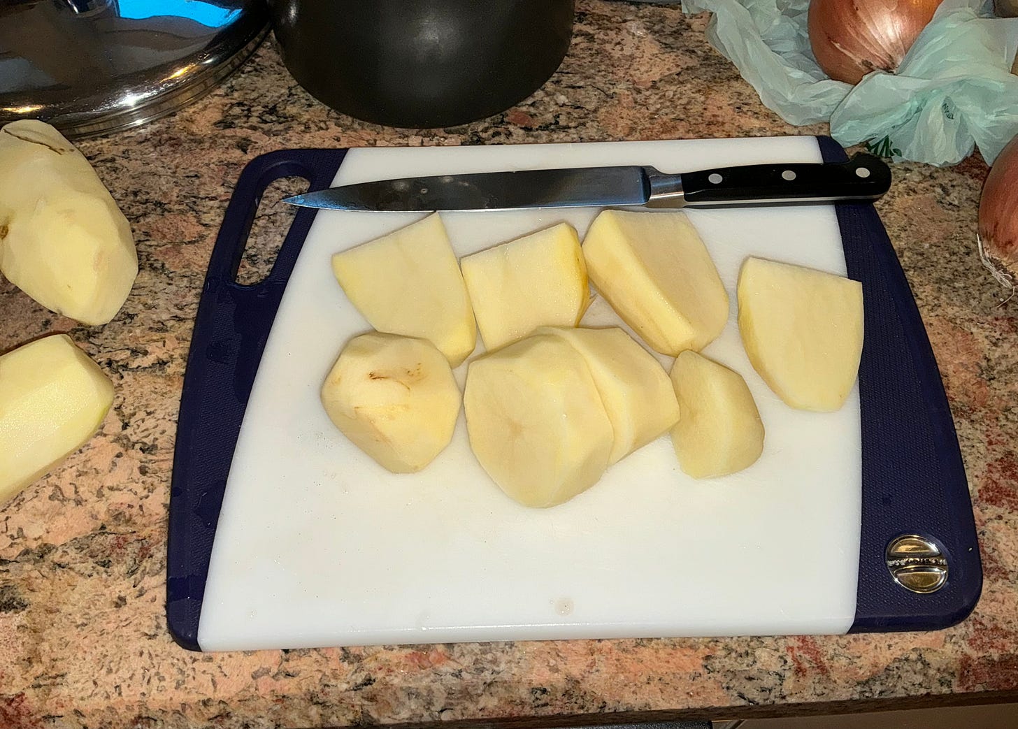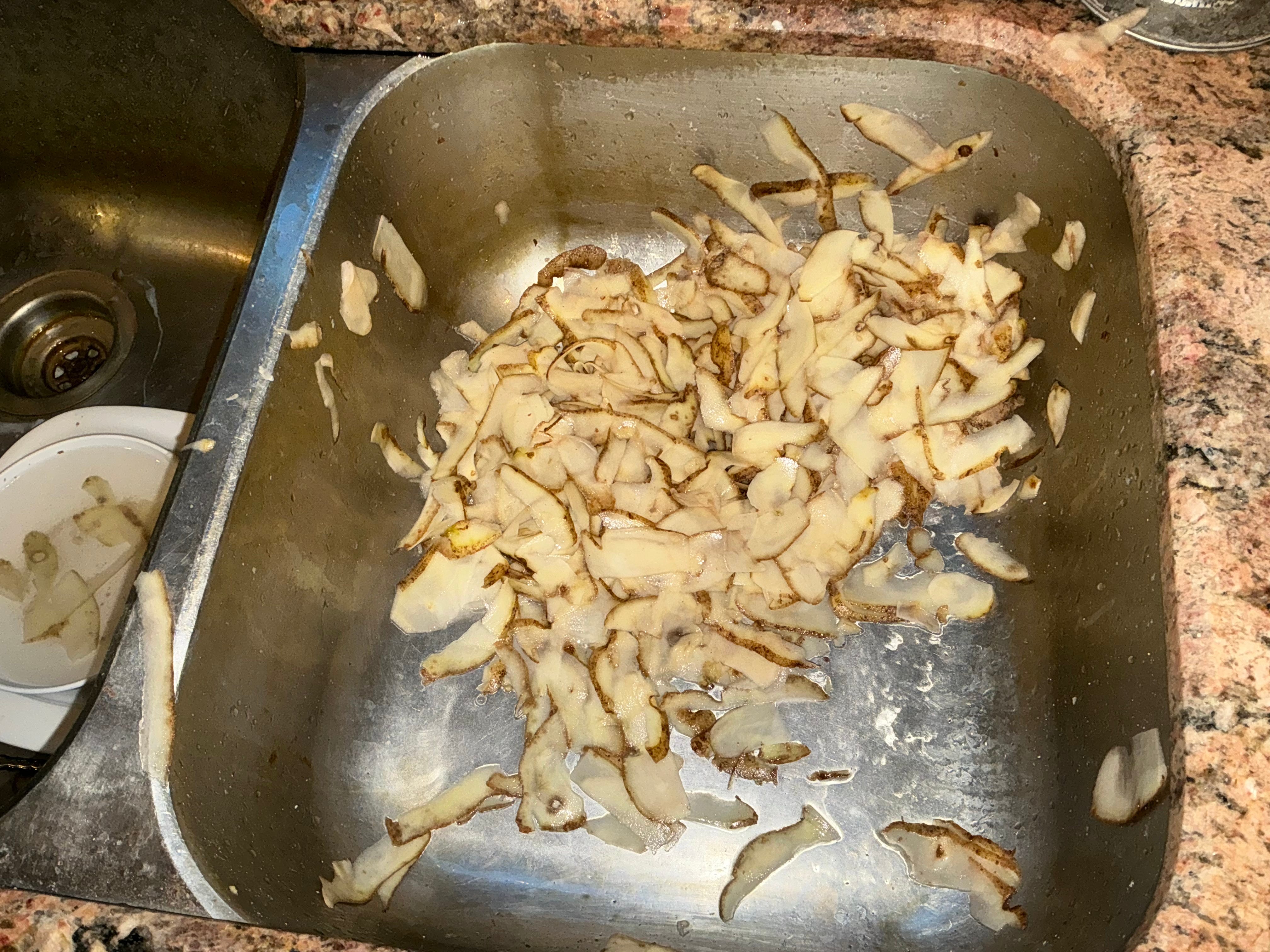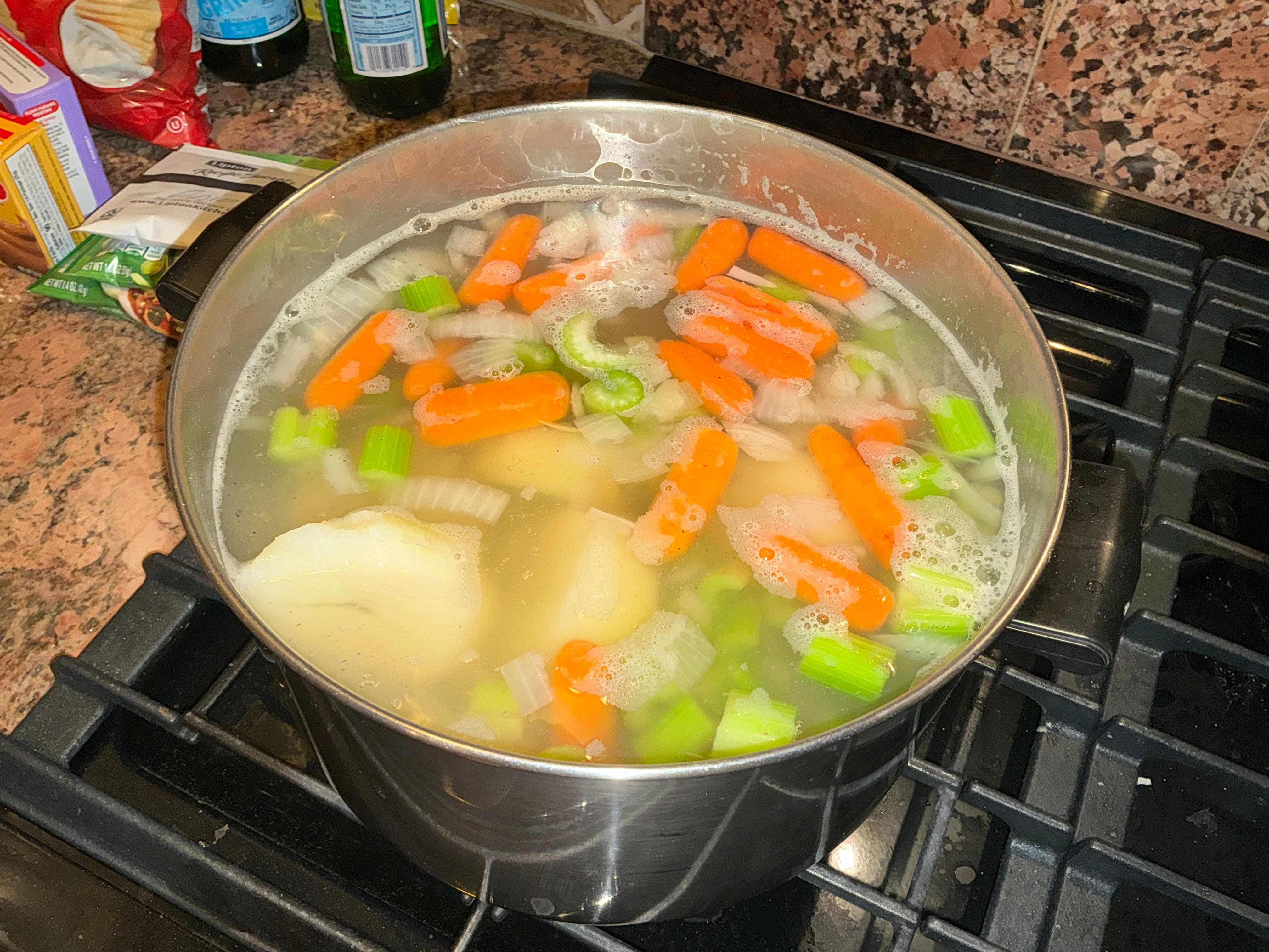 By this point, the potatoes will have been boiling for about an hour. The carrots are usually the last to soften, but everything should mash easily. My mother never used the baby carrots shown here — she sliced up whole carrots, sometimes peeling them first.