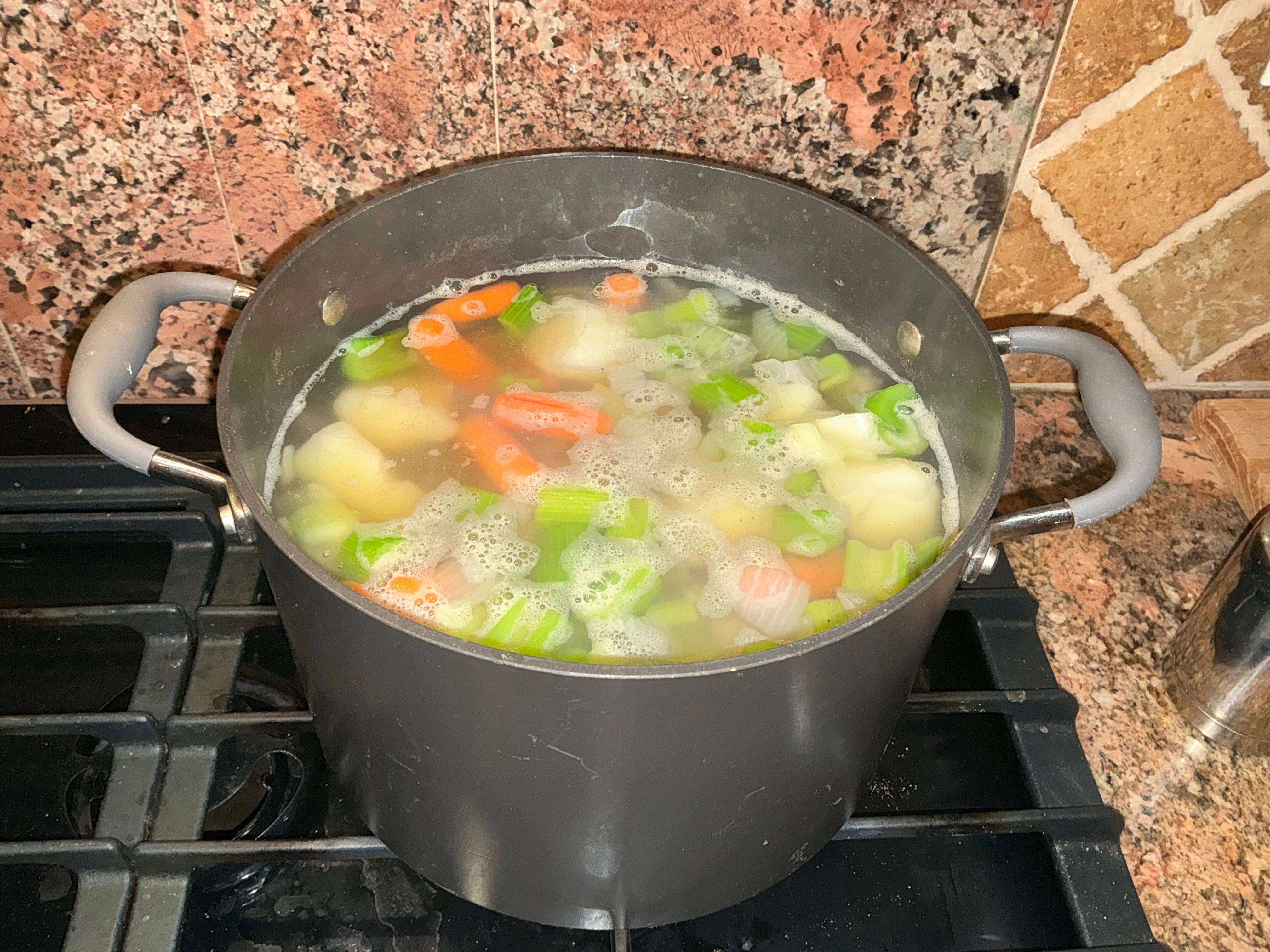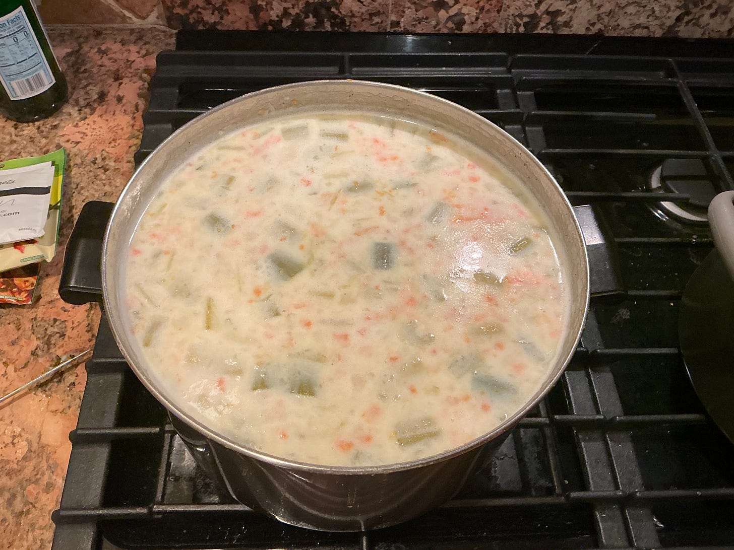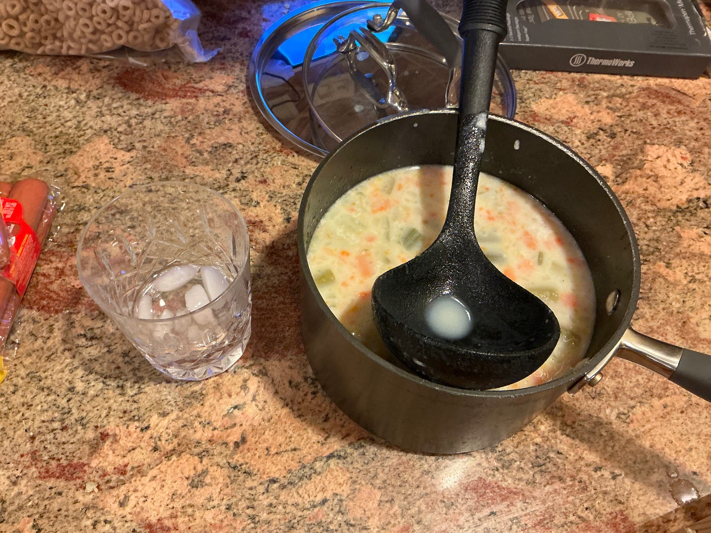 Right after the thermometer photo above, I went straight to the finished soup. What I didn’t show was the step that comes just before that: take out a potato masher and gently mash all the soup ingredients together. Careful — the water is hot and can be splashy if you’re not paying attention.