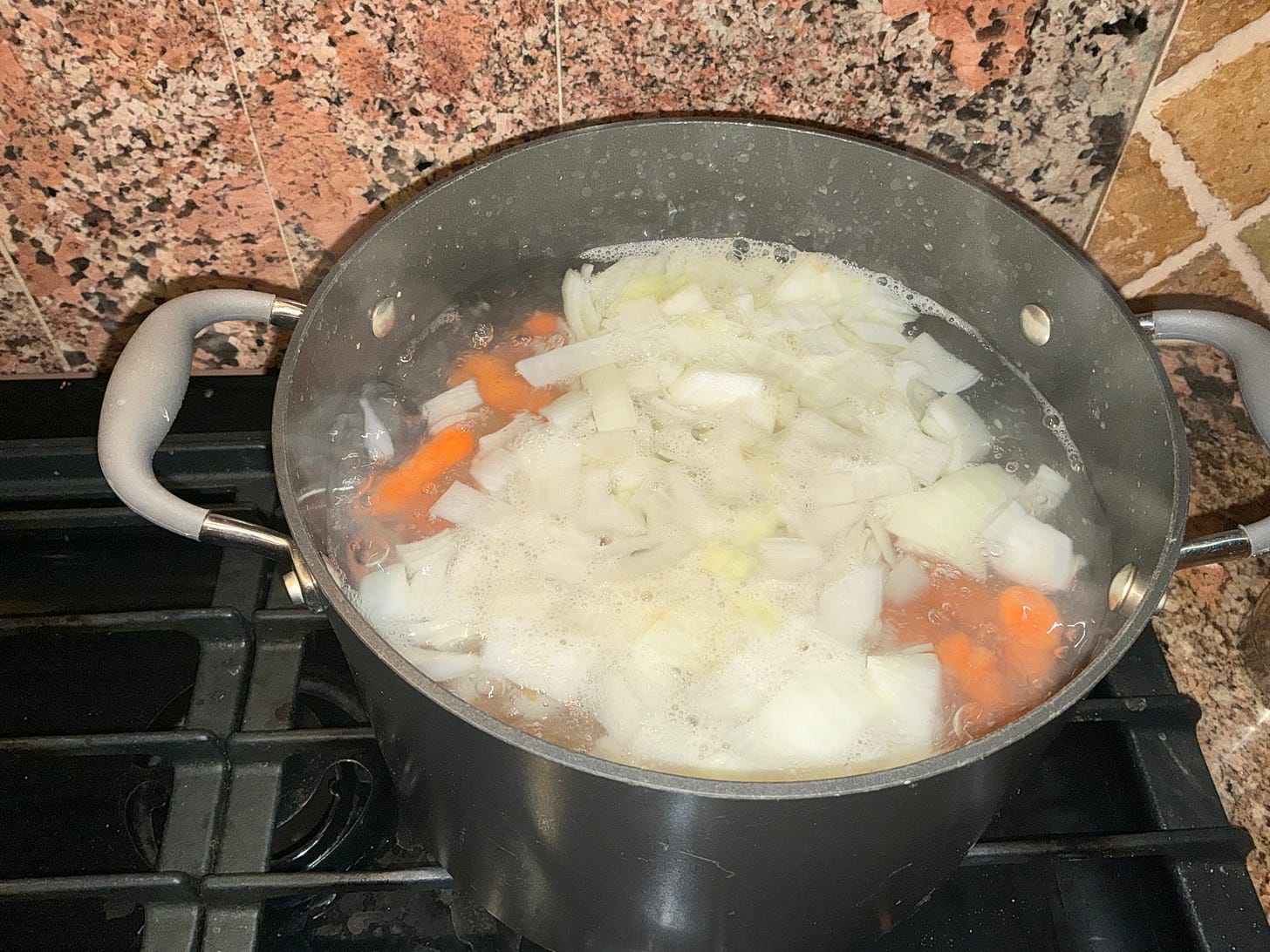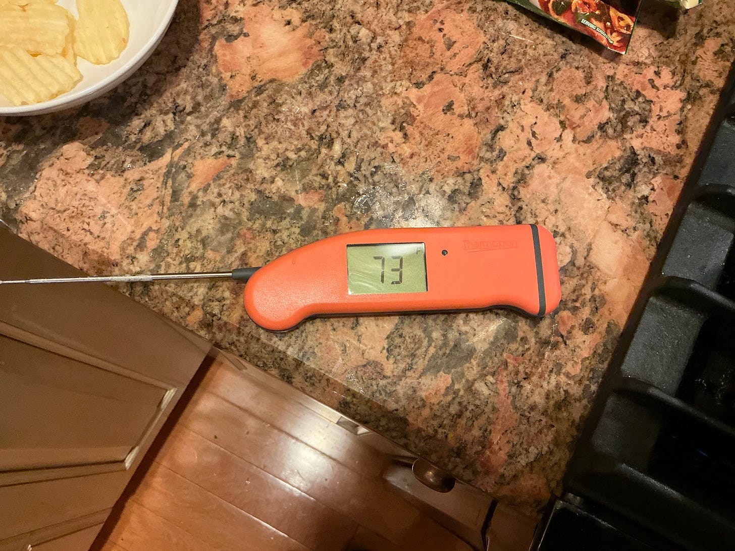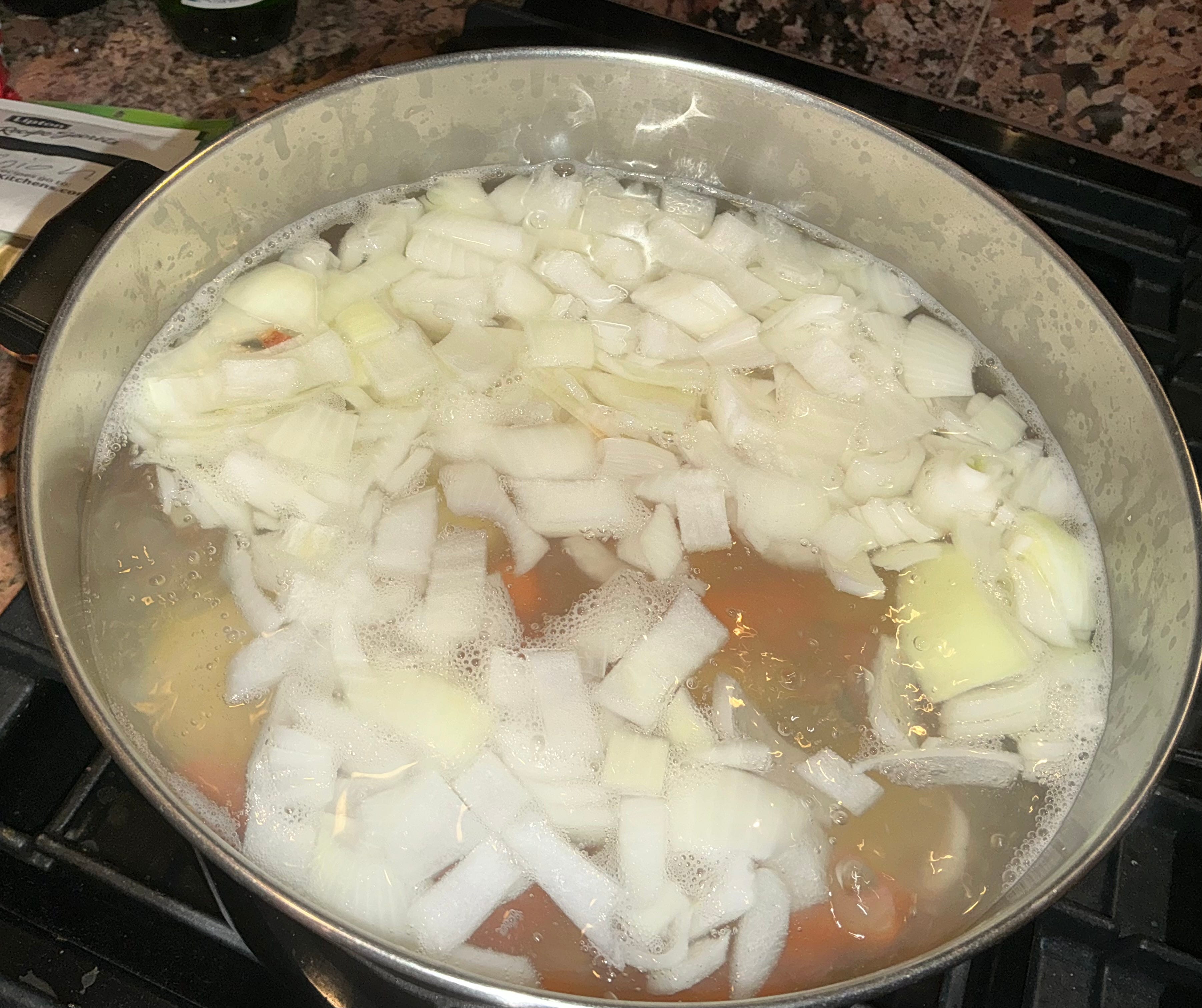 Right after the thermometer photo above, I went straight to the finished soup. What I didn’t show was the step that comes just before that: take out a potato masher and gently mash all the soup ingredients together. Careful — the water is hot and can be splashy if you’re not paying attention.