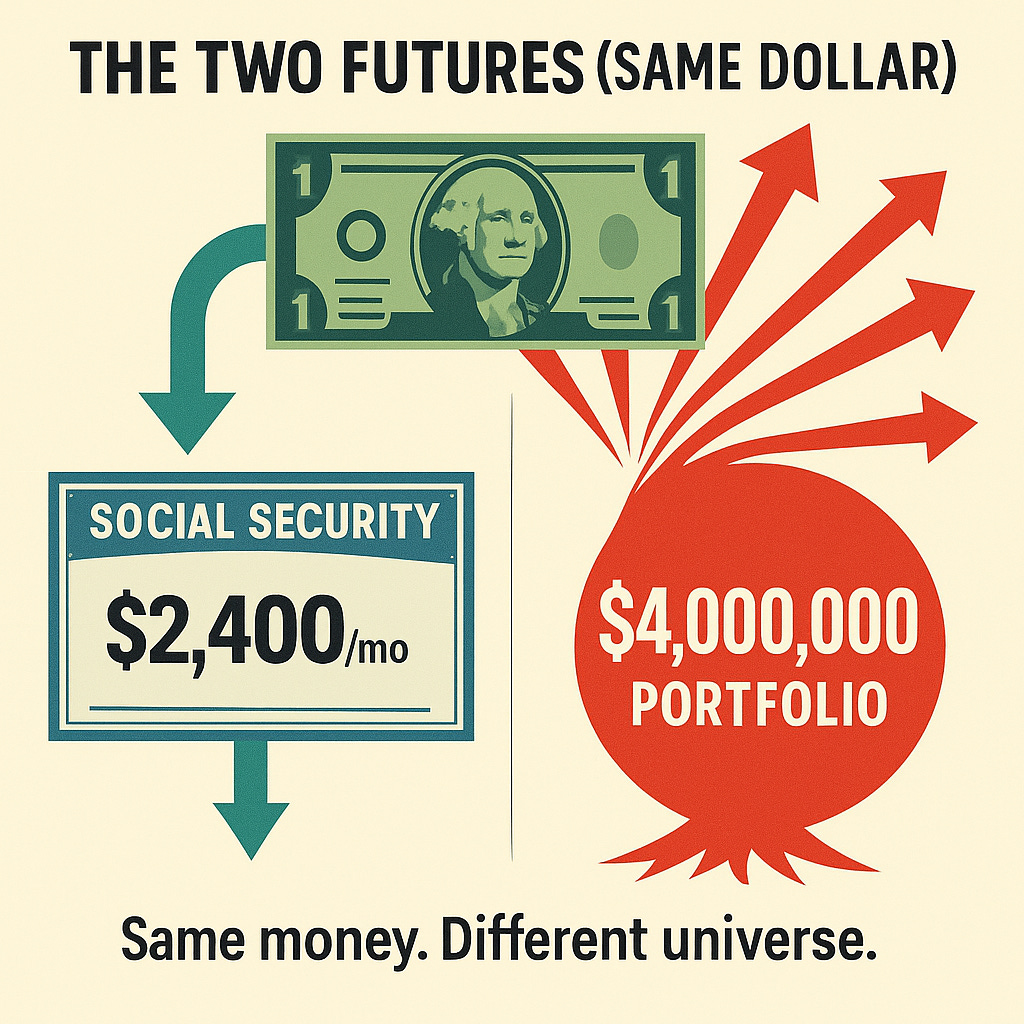 So, instead of receiving $2,400 a month from SSA, you have a nest egg worth $4M. Again, the same money contributed — just an entirely different result.
