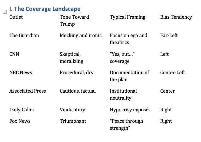 Left Bloc (Guardian, CNN): Used irony, conditional verbs, and personality focus. “Everlasting peace” became “ego fulfillment.” Every positive development was offset with an ethical caution or digression into Trump’s character.