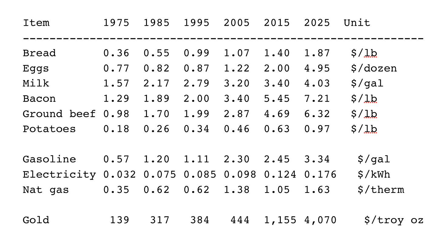 Table: Prices by decade: 1975-2025. Note the starting and ending values of each row.