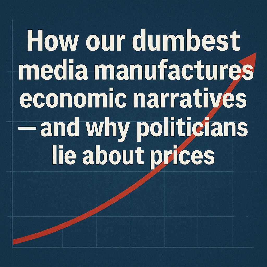 A short forensic breakdown of how our dumbest media manufactures economic fairy tales — and why politicians lie about prices even when they know better.